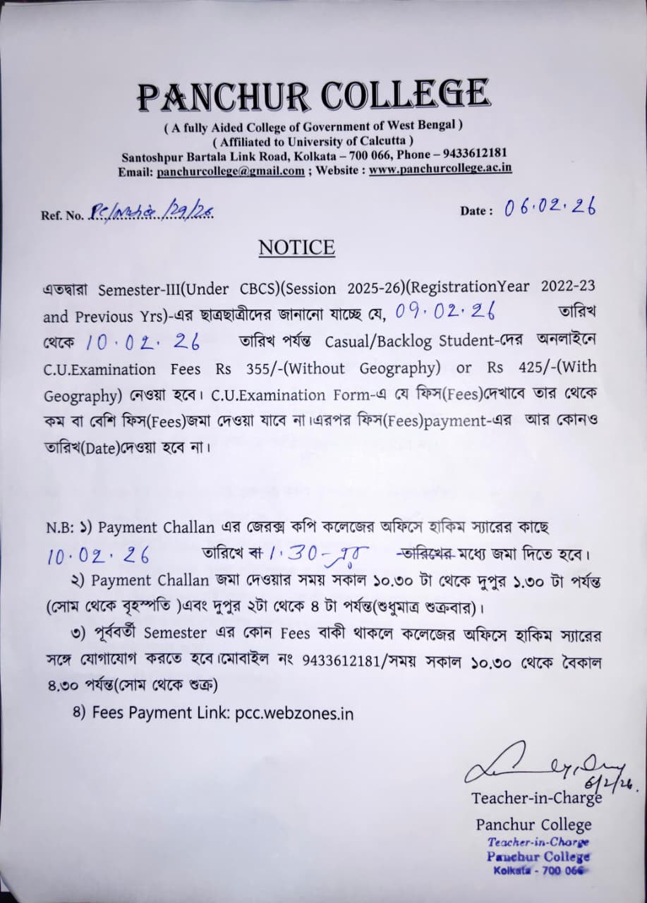 Notice for Semester-III (Under CBCS Registration Year 2022-23)(Session 2025-26) C.U Examination Fees