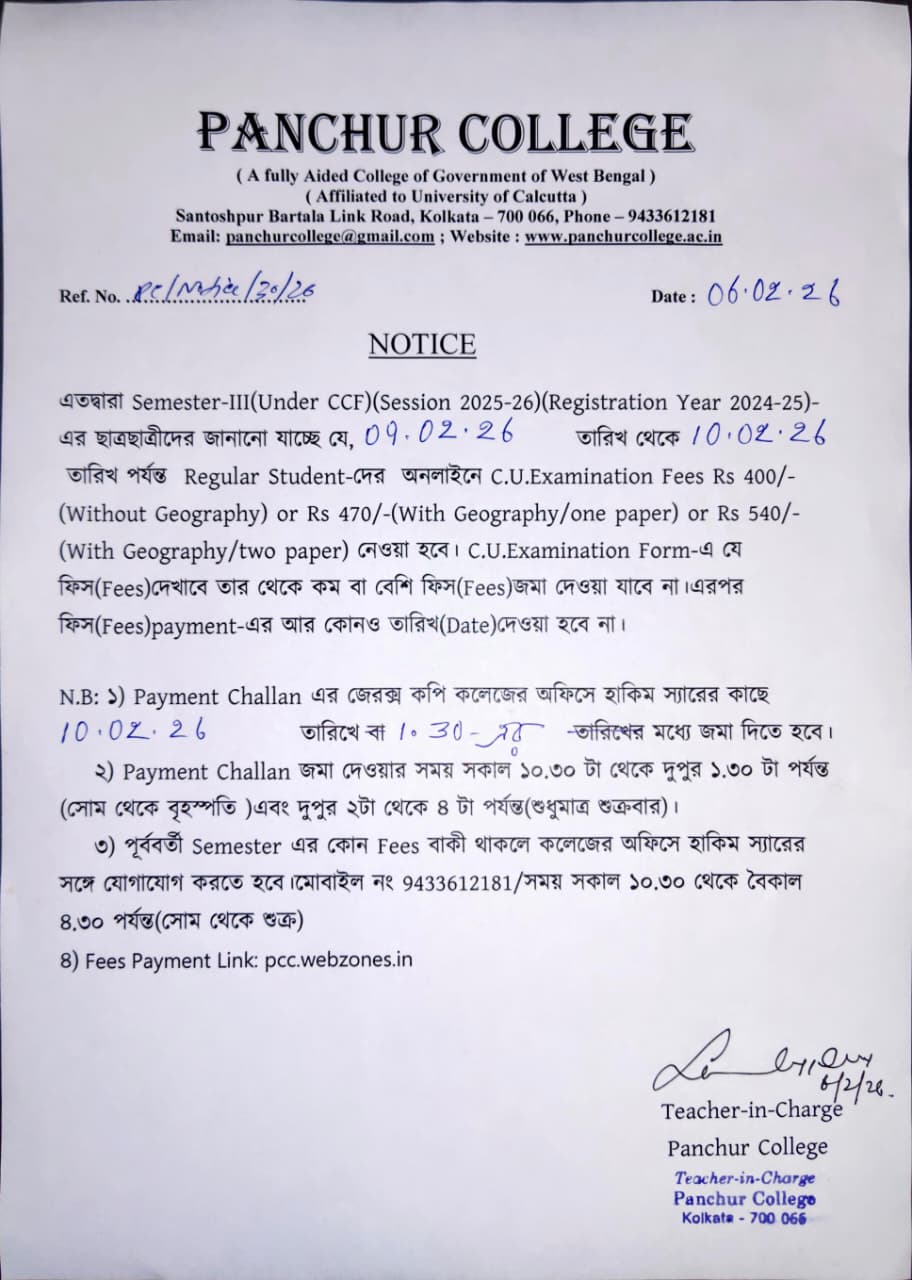 Notice for Semester-III (Under CCF)(Session 2025-26) C.U Examination Fees